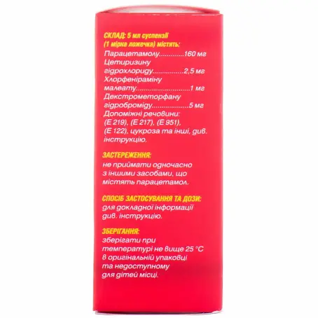 5 мл суспензии содержат парацетамола 160 мг, цетиризина гидрохлорида 2,5 мг, хлорфенирамина малеата 1 мг, декстрометорфана гидробромида 5 мг;