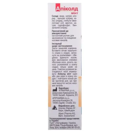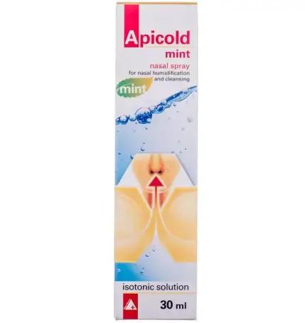 Назальний спрей Апіколд минт нормалізує функцію слизової оболонки носа природним шляхом. Мелкодісперсний ізотонічний розчин діє на всю поверхню слизової оболонки носа. Склад виробу допомагає відновити природний рівень рН і гідратацію слизової оболонки носа, а також сприяє зволоженню сухої слизової оболонки та видалення сухого секрету з порожнини носа для полегшення дихання. Додавання масла ментолу і евкаліпта викликає приємне відчуття свіжості після використання.