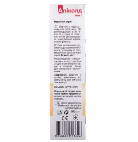Не рекомендується дітям віком до 4 років. Особам з підвищеною чутливістю до окремих компонентів вироби не рекомендується використовувати спрей Апіколд Мінт.
