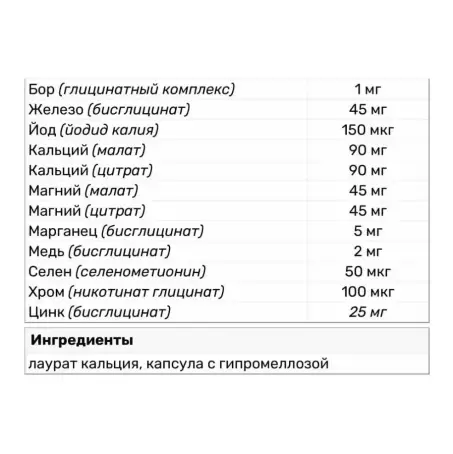 | Залізо (піколінат заліза) | 45 мг | 250% |